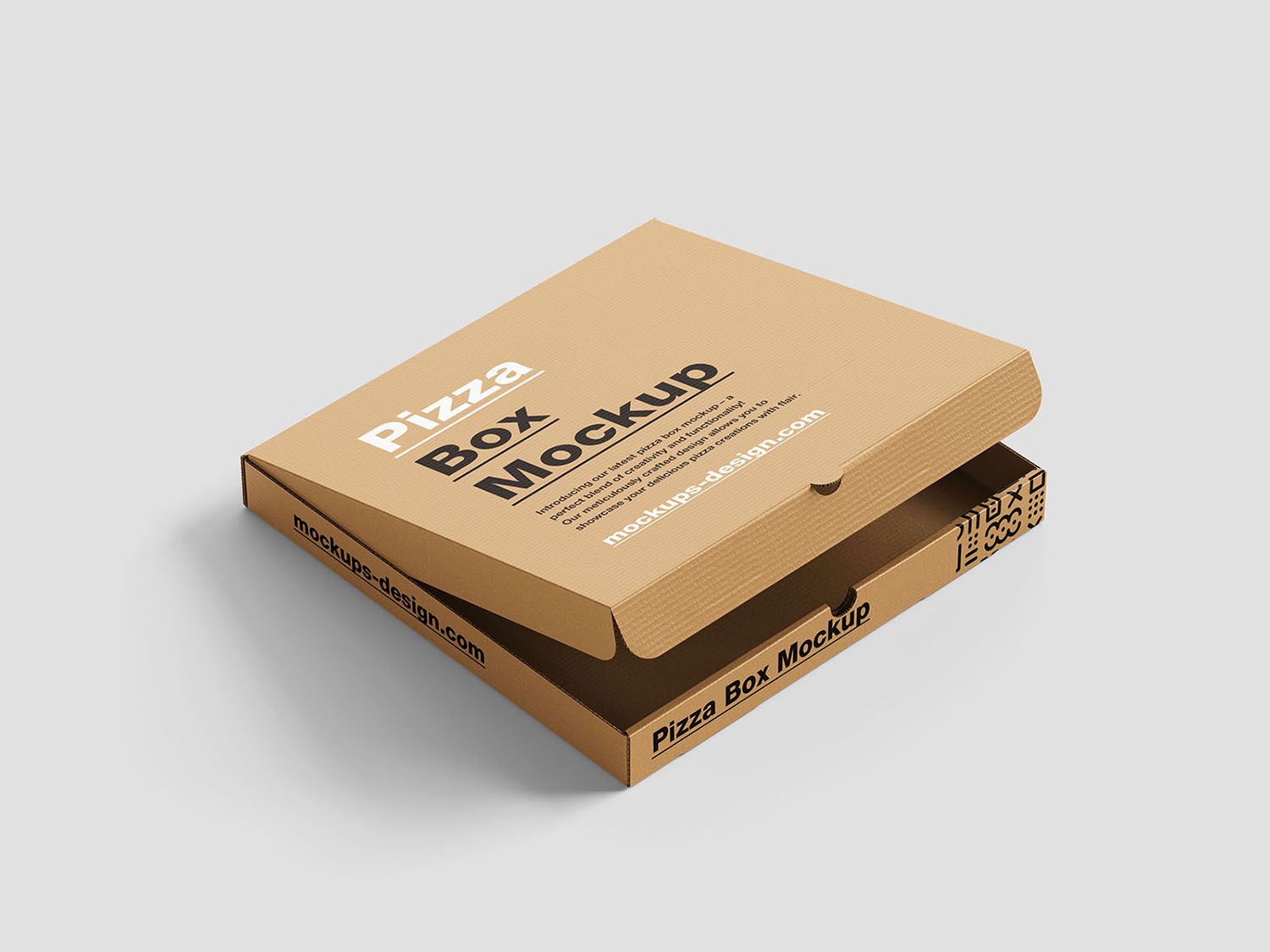 The mockup features a top-down view of an open pizza box, allowing for a clear and comprehensive display of the box’s exterior and interior surfaces. The high-resolution details of the cardboard texture, folds, and edges create a lifelike and authentic appearance, ensuring that the final presentation closely mirrors the real-world product.