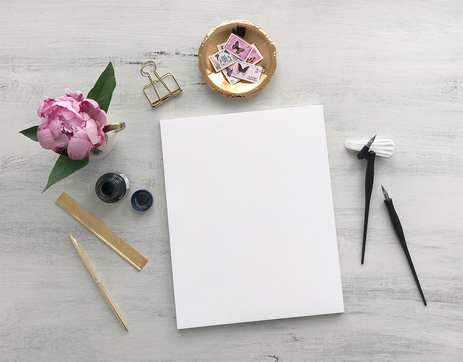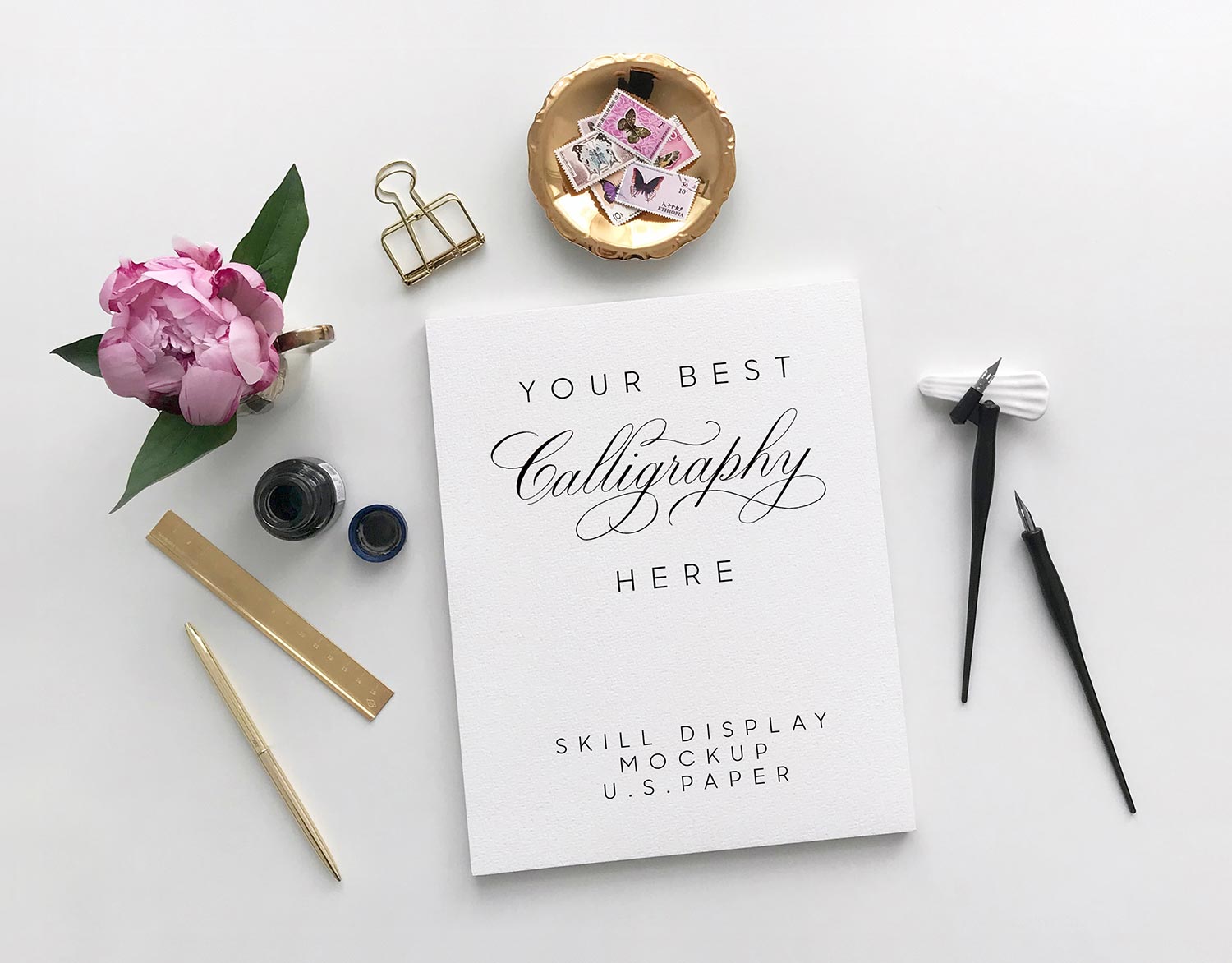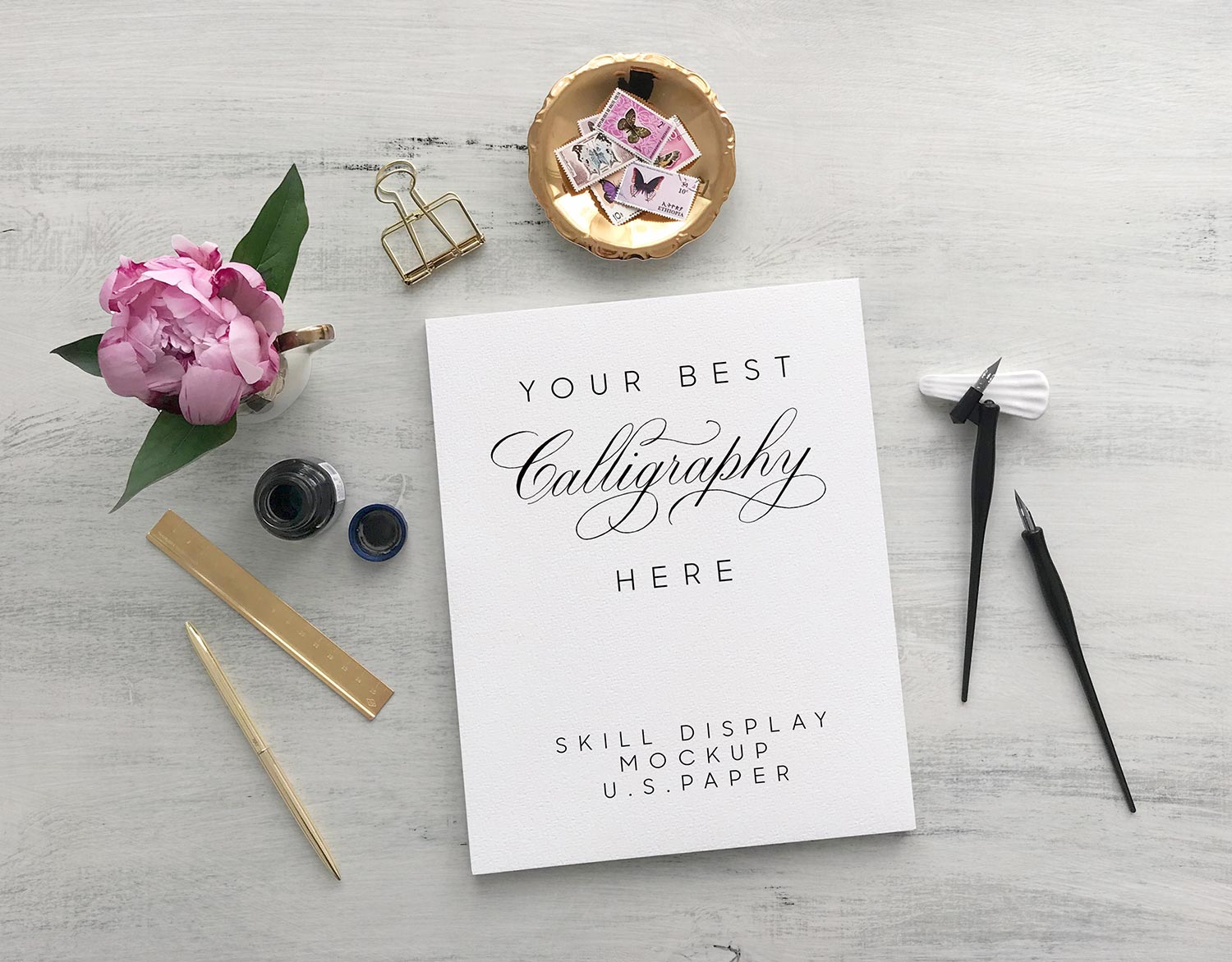 A refined mockup showcasing a US letter-size paper sheet designed for presenting logos, calligraphy, or elegant typographic branding. This scene is perfect for highlighting handwritten lettering, signature-style logos, or minimalist brand marks with a clean and sophisticated look. The realistic paper texture and subtle lighting enhance fine details, making ink strokes and typography feel natural and authentic. Ideal for calligraphers, designers, and branding studios, this mockup helps visualize how delicate designs will appear on real stationery. The minimal setup keeps attention on the artwork, making it suitable for portfolio showcases, client presentations, or branding previews where craftsmanship and precision matter.